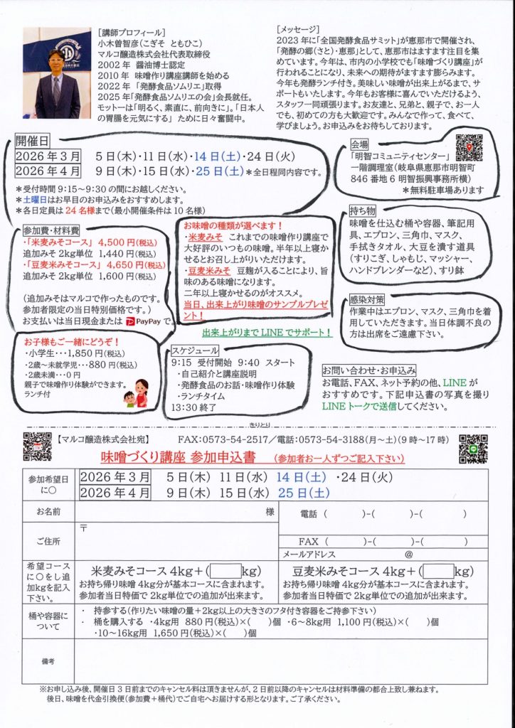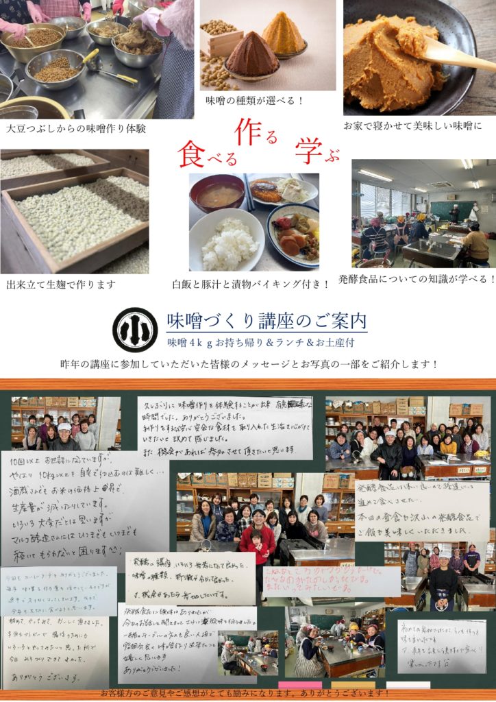 今年も味噌づくり講座の季節を迎えることができ、皆様にご案内できることを大変うれしく思っております。